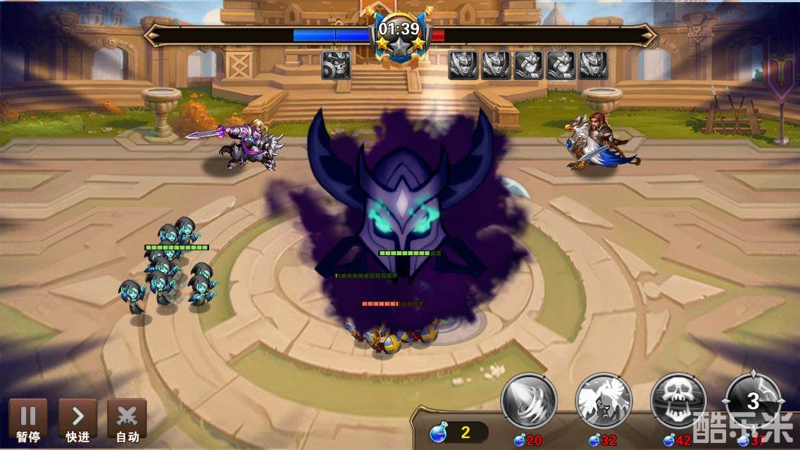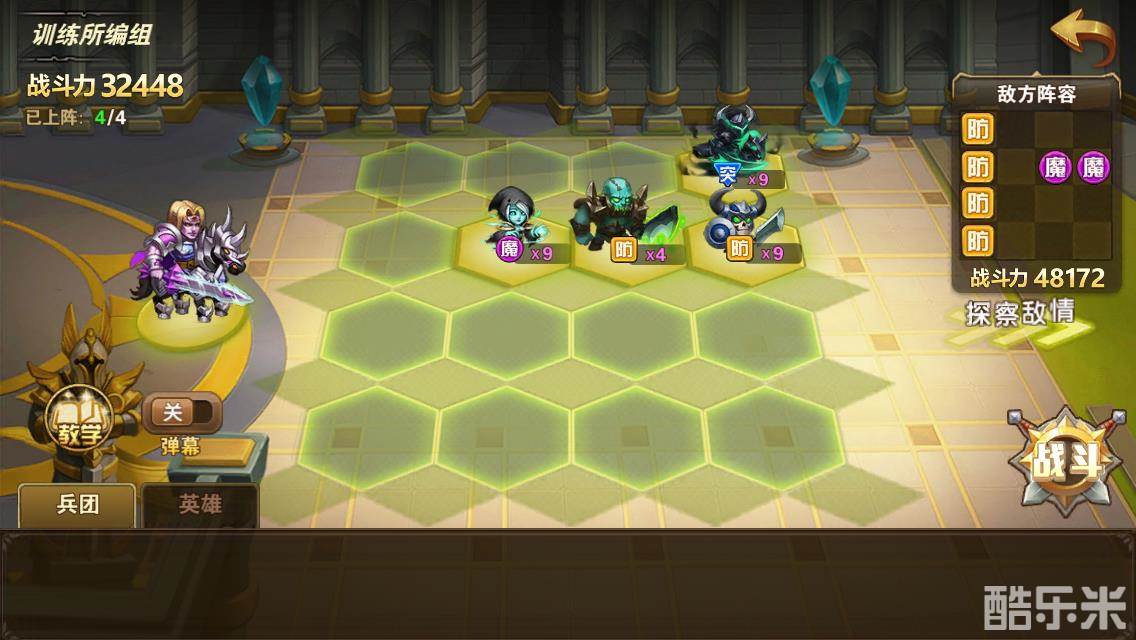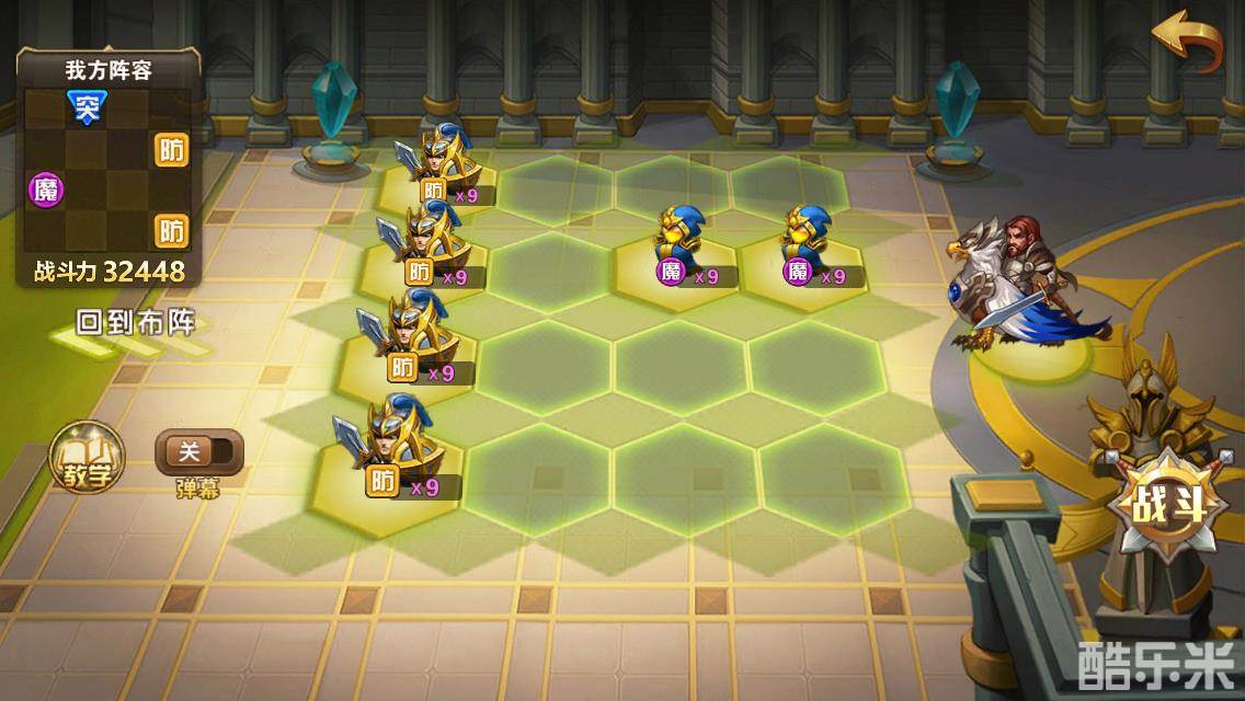 敌方兵团再次摆出了常见的铁桶阵型,前排4个皇家十字军主防御,后排还有2个僧侣在加血,突破正面防御,击杀后排僧侣能极大的加快战斗进程。整合手中现有资源,死亡骑士、僵尸、幽灵、骷髅战士,这四个兵团中,能当此重任的只有死亡骑士。最终阵型如上图所示,死亡骑士选择第一排作为突破口,突破后距离敌方后排兵团最近。第二排前排布置两个防御兵团拉住敌方第二、第三、第四排的防御兵团。后排布置幽灵,沉默敌方第二排全部兵团,主要意义是沉默僧侣,不让僧侣给十字军回血。