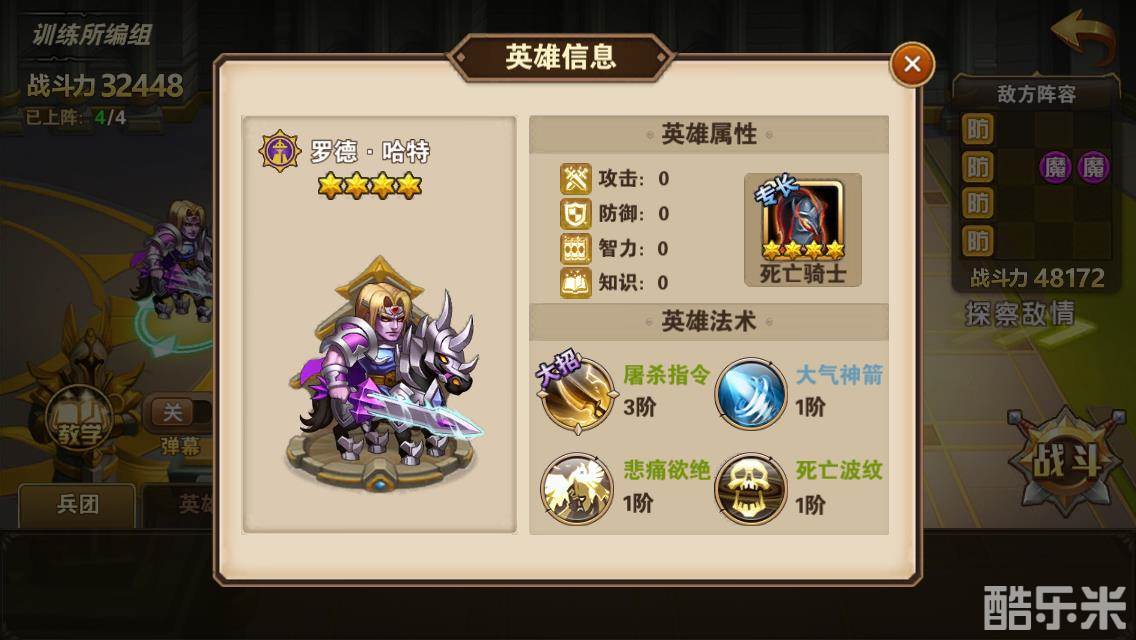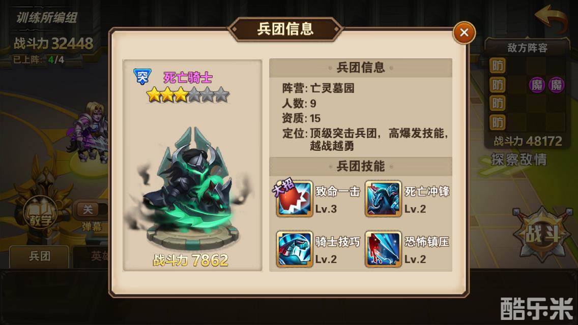 突击兵团破点最重效率,如果正面战场胜负已分,突击兵团即使突破了敌人的防御,很多时候也已经无力回天了。死亡骑士能高效破点的关键在于大招致命一击的高爆发,以及英雄罗德·哈特的全面加持。罗德·哈特的大招和专长加持下,死亡骑士的生命、攻击和技能伤害得到了全方位的强化。重点在于大招可以使死亡骑士立即发动一次致命一击,这也极大的简化了通关的难度,只要大招好了就放,就可以最大化输出。死亡骑士的死亡冲锋技能效果是每击杀一个兵团增加12%攻击,这使得死亡骑士越战越勇。战斗后期当死亡骑士击杀僧侣之后,前排的骷髅和僵尸也差不多被歼灭了,这时死亡骑士单挑敌方两个十字军的底气就在于多次叠加的死亡冲锋。