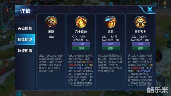 狄仁杰的普攻会增加自身一定比例的移速和攻速,持续一段时间,最多叠加五层。此技能保证了狄仁杰的生存能力和输出能力,给予了他非常强的风筝敌人的能力。