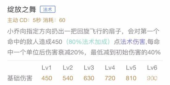 数据分析:虽然扇子的伤害会随着命中单位的增加而衰减,但是只有40%威力的扇子也是不容忽视的,且命中的第一个敌方目标会造成高额的伤害,可以轻松的将其击杀。由于这是小乔最常用的技能,因此推荐主加该技能。