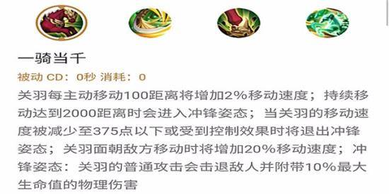 整体解析:关羽的在移动过程中黄条数值会不断增加,当关羽移动了2000距离时,黄条数值便达到375满值,此时关羽进入冲锋姿态。小技巧:关羽在面向草丛时,若草丛中有敌方英雄,关羽的马头会亮,队友同样可以看到,可以用此技巧来探草丛。注意要点:不时走位保持冲锋姿态,紧接普攻会打出击退效果与伤害。