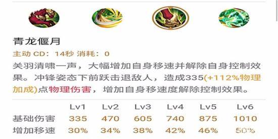 整体解析:关羽旋转大刀对周围敌人造成物理伤害。在冲锋姿态下,关羽向前冲锋,并在结束时向前劈砍造成第二段伤害。该技能推荐主加,它使得关羽拥有很强的清线能力,可以使用一技能快速清线,然后利用自身高机动性去协助队友。注意要点:关羽在冲锋姿态用一技能劈砍推回敌人,打出伤害和控制效果,倘若一技能冷却中,可不断走位再次进入冲锋姿态用普攻推回,切记不要刻意等一技能冷却好再推人,两种推法,组合使用!