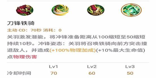 整体解析:普通姿态下,开启大招的关羽将冲锋准备距离缩短,可使关羽在十秒内迅速进入冲锋形态,配合一二技能,关羽能快速移动扰乱全场;冲锋姿态下,关羽冲撞范围敌人造成物理伤害与击退效果,在十秒内关羽可以快速进入冲锋形态,和上述效果相同。注意要点:建议多用冲锋姿态开启大招,造成物理伤害并撞退敌军的效果。