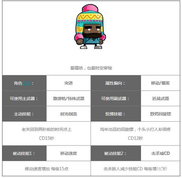 看老关这身穿着就知道这个角色肯定带有嘻哈属性,带着毛线编制帽,黝黑的皮肤,看着还挺可爱。老关爱Rap,也爱摇滚音乐,他的音乐有一种魔力,让听众们沉醉。而他还有个不为人知的超能力,那就是时空穿梭。