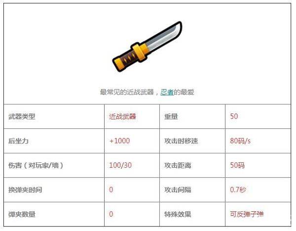 《反斗联盟》目前版本中的武器并不算多,总共17种,我们这里为大家介绍一下每种武器的属性以及其在实战中的效果,首先要介绍的游戏中的短刀,近战武器在《反斗联盟》中还是很强的,虽然距离短,但其他属性都很优秀。