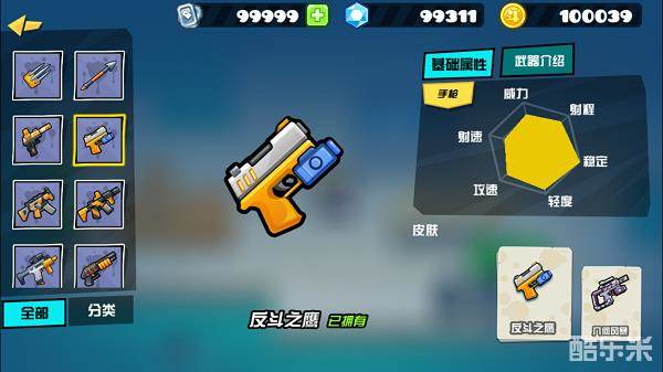 反斗之鹰,在手枪类副武器中,比起同款的消音手枪在为威力上有所提升,相对射速比消音手枪慢了不少。这里选择了反斗手枪是因为对老大爷来说,副武器是在榴弹枪打完以后用来补刀或者是切换副武器来让大老爷在战场上移动速度不被自己的榴弹枪影响的,选择攻击高些并在轻度上和消音差不多的反斗之鹰是最适合的。