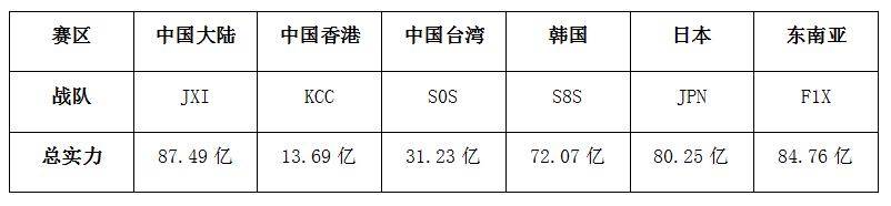 目前6个赛区的出赛战队,实力最为强盛的,是中国大陆赛区代表队,[JXI]战队,总实力高达惊人的87亿,领先于日本、韩国等其他参赛地区!