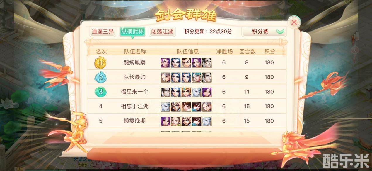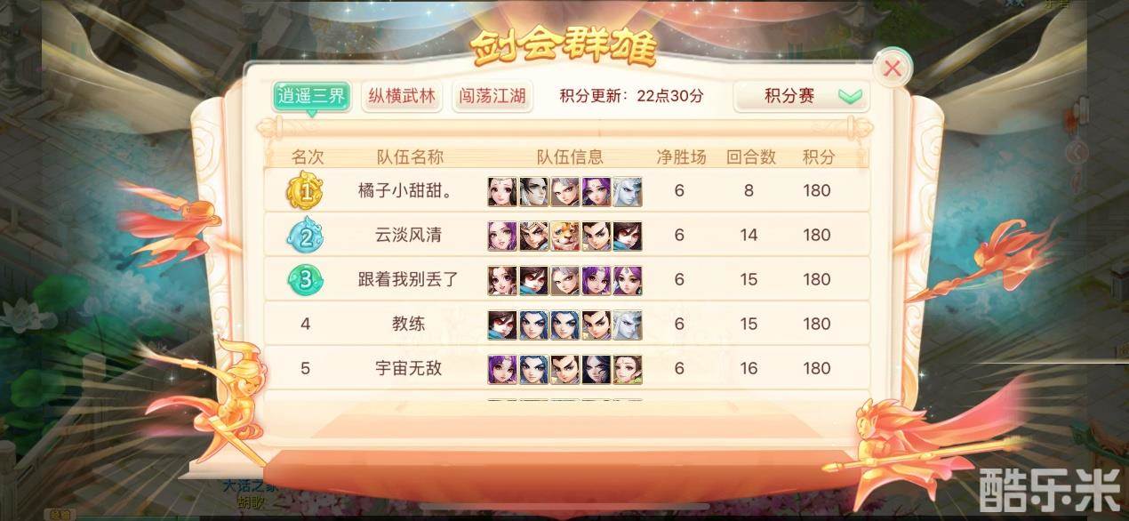 经过周末两天两轮积分赛的巅峰对决,“橘子小甜甜。”(逍遥三界)、“龍飛鳳躌”(纵横武林)、“守护朵朵”(闯荡江湖)等玩家凭借优秀装备搭配与不俗的PK技巧,率先抢得晋级先机!本周末连续两天,“剑会群雄”分级赛积分赛将进行最后两轮的角逐,进过前面两轮的试探,究竟哪些玩家能够突出重围,晋级淘汰赛阶段?让我们一同拭目以待!