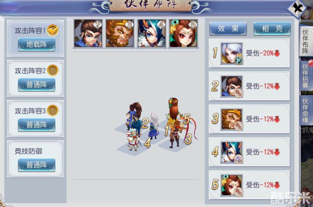 伙伴可布置成不同的站位生成阵法效果,提升战斗力。不同的阵法互相克制,可收集相同阵法提升阵法属性。
