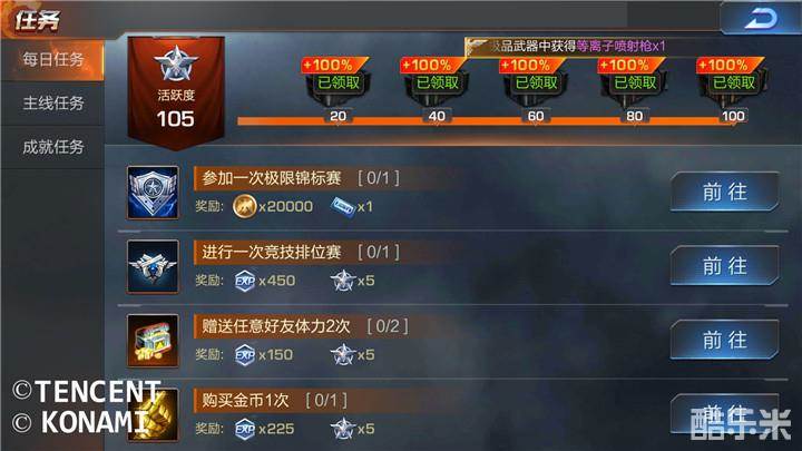 每日任务顾名思义就是指挥官们每日上线游戏所要完成的日常任务。总共分为五个奖励宝箱,宝箱下边的进度条对应的是可领取的宝箱,活跃度达到100后即可全部领取,想要增加自己的活跃度就要完成指定的任务。