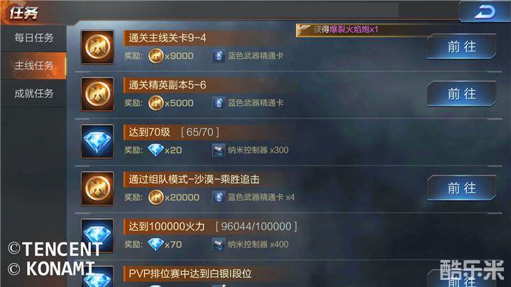 主线任务的奖励分为金币和钻石两种的,想要领取钻石奖励,必须要达到任务的指定要求,比如说等级达到70级或者活力值达到100000,给自己定一个小目标,会更有干劲!奖励一般都是几十颗钻石左右或者还加点武器碎片和武器精通卡。