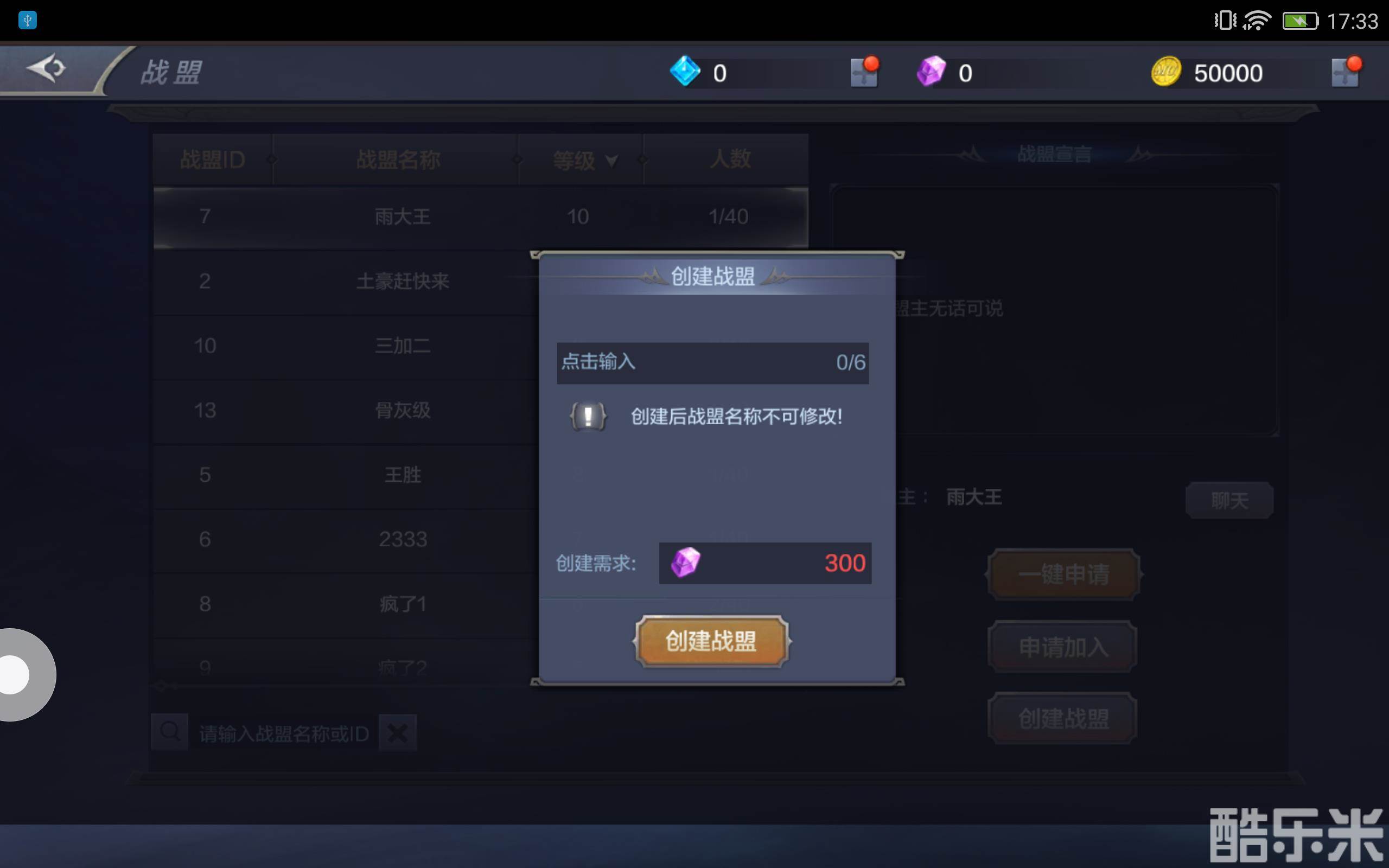 玩家在战盟界面点击创建战盟花费300粉钻,输入钟情的战盟名字即可创建战盟。