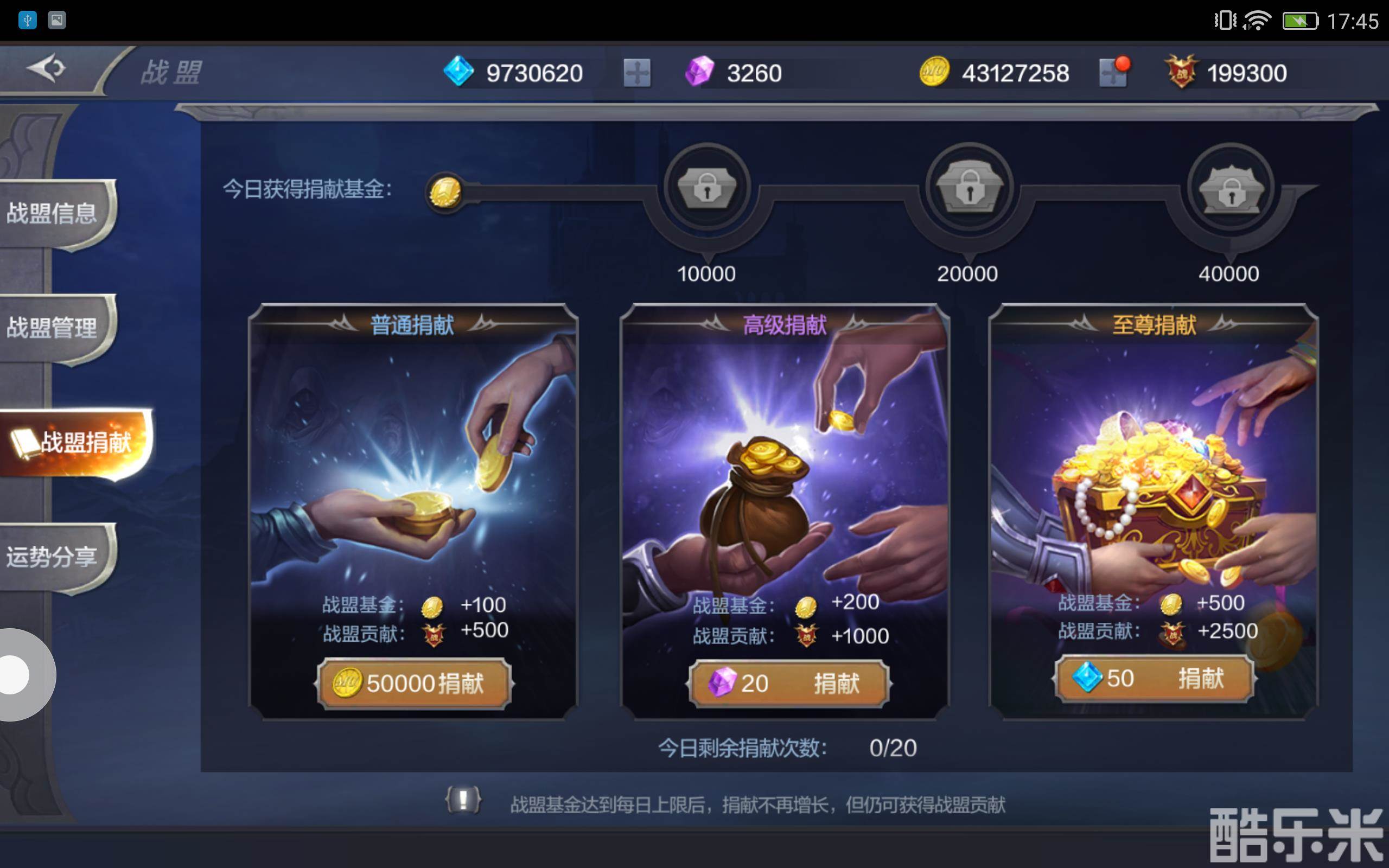 玩家可以在战盟捐献界面进行捐献,捐献有三种分别为:普通(金币)、高级(粉钻)、至尊捐献(蓝钻),提升战盟基金和获得战盟贡献,当战盟成员捐献基金达到一定金额可领取宝箱。
