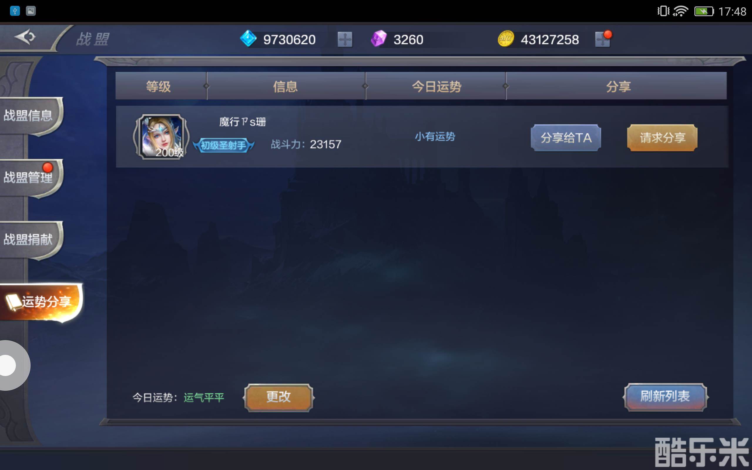 玩家可以在运势分享界面中分享自己的运势也可以请求其他成员分享给你;在右下角花费蓝钻更改自己的运势。