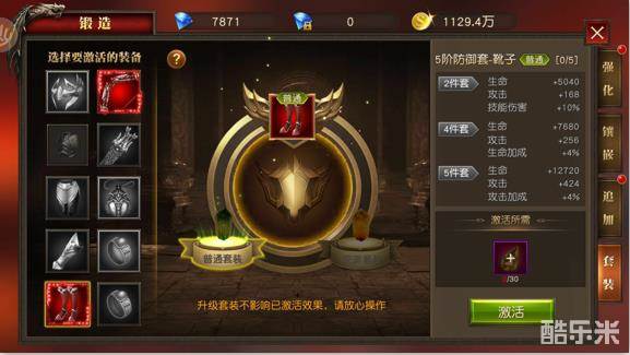4. 更换装备时,如果装备已经激活套装属性,将返还所有已经消耗的材料。更换同阶装备直接继承套装等级。