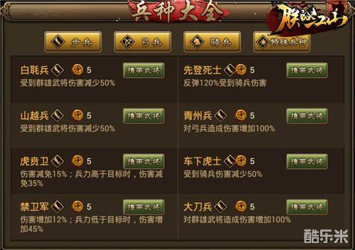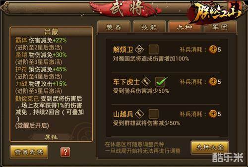 由于每个武将能带的兵种有限,选择的空间并不是很大,有些时候就要看当前版本的生态环境进行选择。当你用吕蒙作为前排的时候,他只有“车下虎士”、“山越兵”两个兵种适合。此时就要分析自身所在官职段位的情况,究竟是碰到的非群雄骑兵多还是群雄武将多,并选择克制它的兵种。