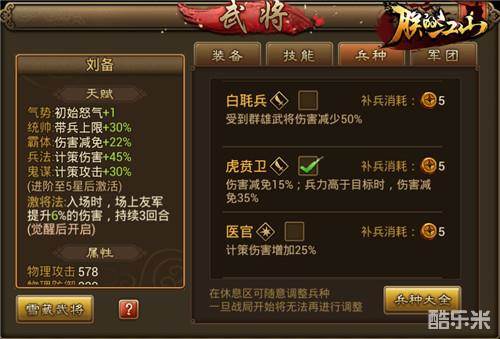 为自己的前排配置兵种的时候,一般要根据前排武将的特性,在减伤、回复、反弹这几类兵种之间选择。以刘备为例子,他作为一个全职的奶妈,当然是活得越久发挥的作用就越大,因为刘备自带“统帅”天赋兵力自然比其他武将多,所以选择“虎贲卫”的伤害减免就能获得最大收益。舍弃“医官”的25%增伤虽然会减少一些奶量,但活得更久多奶几回合作用就更大了。