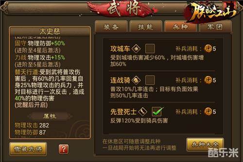 根据武将技能的特殊性也可以选择一些另类的兵种,如果你有觉醒的太史慈,利用“先登死士”的反伤效果配合觉醒技能的反击,怕是别人根本都不想打你了。最后补充一些特殊情况,如偷空城主推“攻城车”,打物理队伍选择“藤甲兵”等等。