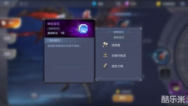神佑宝石可以作为装备的高等级强化材料,并且使用后装备强化失败不掉级。玩家可以在人物等级达到180级之后进入迷失之城获得,除此之外还可以通过完成各种任务来提升活跃度后获得,可以通过交易行来购买此道具。