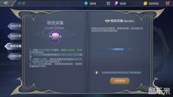 物资采集是每天必做任务,一天只能完成一次,每次完成后都有大量的经验。要注意的是在接任务之前记得把自己的今日运势提高到最好哦,能够减少采集的时间。也可以和好友组队接任务,也能减少大量的采集时间。还有一个日常任务也是每天都可以接的,一共有3轮,每轮10次,拥有大量的经验,而且日常任务是不需要玩家操控的,可以自动作战。
