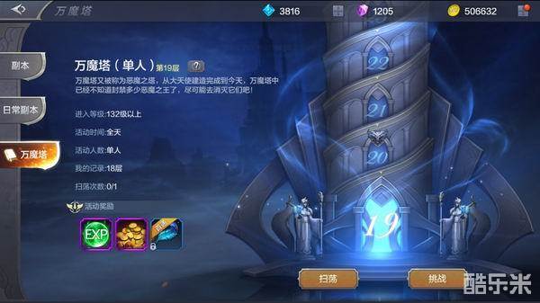 当任务都完成之后,可以考虑去刷副本或者万魔塔。经验副本每天可以刷两次,每次经验都是固定的,所以不用开加倍经验卡,是没有加成效果的。万魔塔可以一直刷层数,虽然经验不多,但是万魔塔也是掉落升级翅膀的道具的主要场所哦。