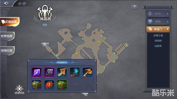 看懂地图是进行游戏的先决条件。对应不同的角色等级有不同的区域,达到区域要求等级后该区域才会对角色解锁。点击右上角的缩略地图进入地图页面,这时候可以看到所在区域的详细地图,点击地图上的任意一点或者右侧选项栏的一个项目,你的角色就会自动移动到指定位置。虽然在任务中会自动寻路,但在任务之外这一技能就显得十分重要了。此外点击地图页面左下角的掉落预览还可以查看所在区域主要出产什么资源。