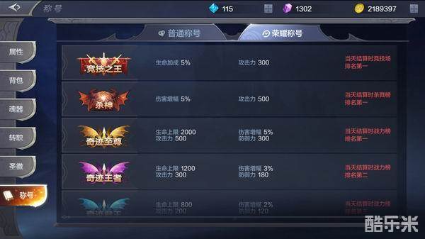 称号:获得称号不仅可以提升自己的生命上限,还可以提升自己的战斗力。如果想快速提升战力的话,可以靠竞技场、杀戮榜、战力榜等这几个排行榜上面获得相应的名次,即可获得自己的荣耀称号,达到提升自己战斗力的目的。