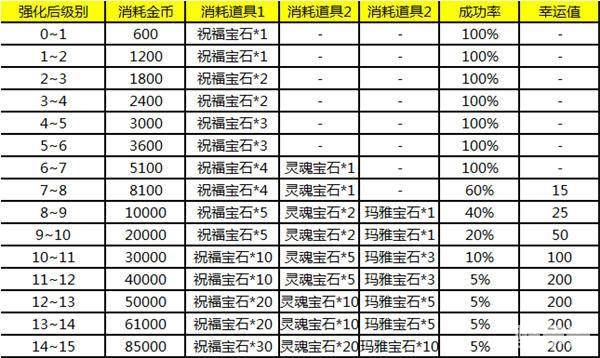装备培养是后期提升装备的重要手段,在前期,玩家可能并没有一件顺手的装备,它没有强大的自带属性,也没有给力的输出或者防御能力,那么玩家这时想要依靠它成为立身之本,就必须对它进行强化,强化需要消耗祝福宝石、灵魂宝石和玛雅宝石,越到后期强化所需要的条件也就越苛刻,消耗的材料也越多,并且当强化等级到达+7以后,强化会开始出现失败,失败的话使用的材料会全部消失,但是会转化为幸运值,当幸运值满了之后,强化必定成功,强化的上限为十五星。