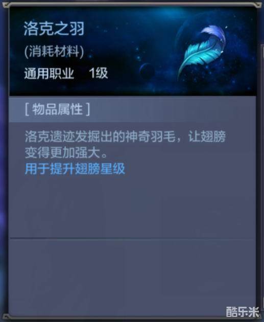 解析:用于提升翅膀星级。每种职业的翅膀都有分很多阶级,每个阶级有10星,不同阶级需要不同个数的洛克之羽。一阶需要1个洛克之羽,以此往上增加。