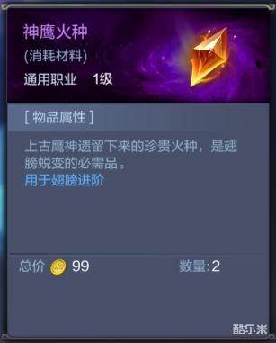 解析:用于翅膀进阶。当一个阶级星级达到10星时就会进阶到下一个阶级,此时就需要神鹰火种来进阶翅膀。阶级越高,战斗力越高,特效也越好看,追求特效的玩家可以多收集这两个道具。
