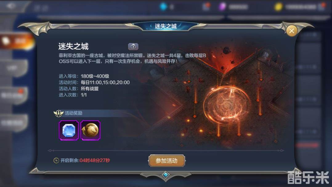 菲利亚古国的一座古城,被时空魔法所禁锢。迷失之城一共4层,以战盟为单位进行活动,击败每层Boss可以进入下一层,只有一次生存机会,机遇与风险并存!