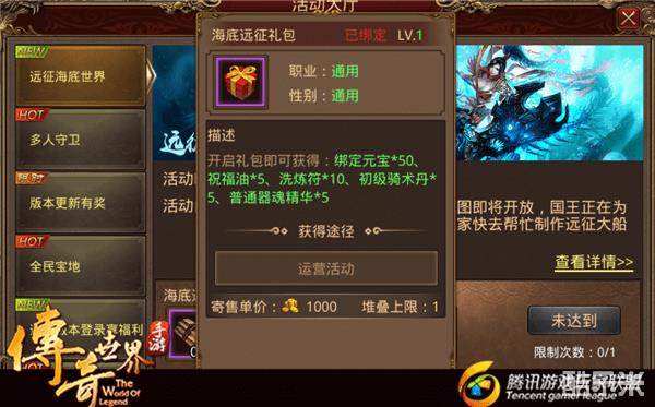 当玩家收集到足够的材料后,可以在活动界面兑换海底远征礼包!礼包包含了50绑元、祝福油*5、洗练符*10、初级骑术丹*5、普通器魂精华*5;玩家每次兑换需要消耗木材、弹药、帆布各10个,每个玩家每天可以兑换一个海底远征礼包!所以道具消耗量并不大,每个玩家都能收集到足够的材料。