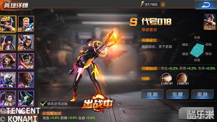 “爆破弹”会向当前018瞄准的方向发射一枚爆裂能量弹,标记命中的敌人,印记在叠加到四层后会眩晕目标。无论该技能命中与否,都会在一定时间内提供一点连击点。“重剑无锋”是018的主要输出技能,技能效果会受到连击点数量的影响。在没有连击点时,会对正前方范围内打出范围伤害和减速效果。在拥有1个连击点时,018会向正前方冲锋,并眩晕敌人。如果拥有两个连击点,那么则会向正前方打出三阵高伤害剑风。在018处于满额连击点时,018会向正前方挥砍数次,造成成吨的伤害和眩晕效果,同时自身处于减伤状态。