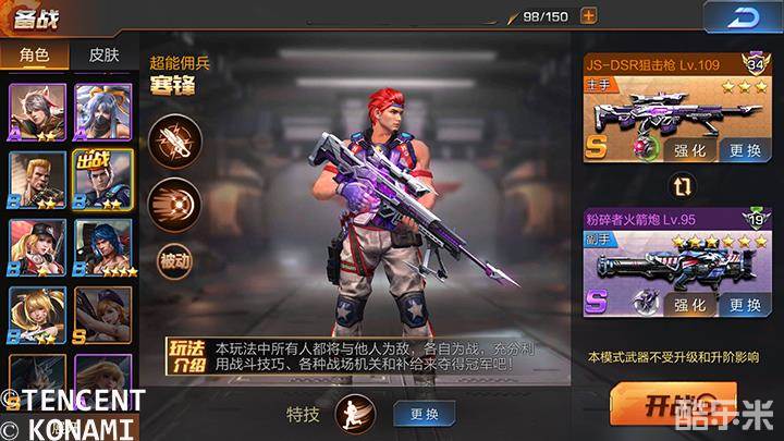 搭配方面,主武器选择连狙类武器,副武器选择火箭炮类武器。这两类武器的杀伤范围极广,主武器负责持续输出,副武器负责短时间爆发,相互配合可以使英雄在大部分敌人攻击范围之外进行输出。特技选择急速,前期可以帮助英雄加速拿到资源,中后期团战中也能配合“电能冲刺”脱离战场。
