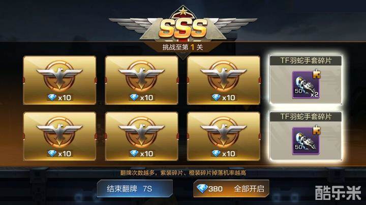 单独匹配游戏的话,每次通关都可以获得两次翻牌机会,翻到什么就得到什么,然后剩余的牌你可以用钻石继续翻开。然而随着指挥官翻牌的次数增加,钻石的花费也会增加,全部开启需要380钻石。这里面也许藏匿着橙色武器碎片、橙色装备碎片、橙色万能装备碎片、紫色武器碎片、紫色装备碎片,紫色装备万能碎片等等,但完完全全看脸。这是第一装备碎片来源,如果是土豪请随意,但如果是贫民,本队长建议,满级之前两次免费翻牌的机会就够了。
