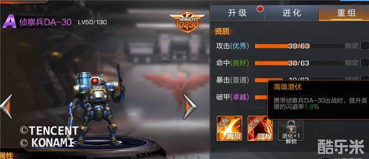 侦察兵DA-30的高级潜伏提升英雄的闪避率1.8%,配合蜂鸟的碧流体术会有很大的程度闪避敌人的攻击哦。《高级闪光弹》可以对命中的敌人造成攻击力298.3%的伤害和眩晕1S,这在擂台PK中是十分好用的。