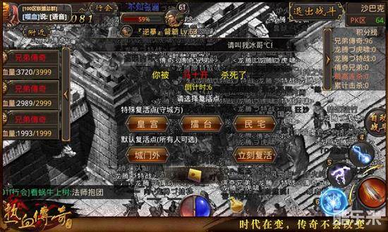 沙巴克中死亡后有好多个复活点,但只有守城方的复活点是可以自己选择的,其他阵营的玩家默认在城外安全区复活,也可以用还魂丹随机复活。如果攻城方复活在安全区,意味着不得不重新从城门或者密道进入内部,但是城门总是有法师防守,而密道路有点长。随机复活的话太过散乱,很有可能刚复活就被巡逻的守方给击杀了,且还魂丹的数量也是有限的,也不保证复活在城内,也有可能是安全区。