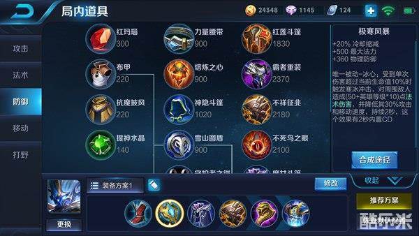 六神装:冷静之靴、极寒风暴、魔女斗篷、不祥征兆、梦魇之牙、贤者的庇护