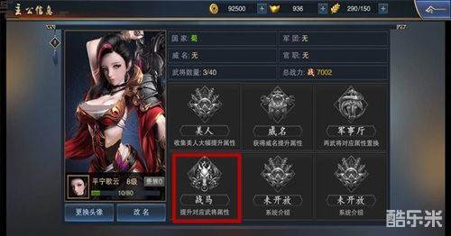 战马系统在提升主公战斗属性方面有着很大的帮助,当玩家通关章节“东吴之虎”后自动开启该功能,玩家可以根据武将的属性配备相应的战马,通过强化战马提升星级,使自己的坐骑拥有更佳的品质。橙品的战马还有附加技能,对战斗力有着更大的提升。玩家可以在日常的游戏中收集并镶嵌马魂。搜集橙品战马,觉醒后战马品质变成红色,并且获得额外属性,战马的孔变为龙魂孔,装备在龙魂孔上的马魂会增加恒定的额外属性。