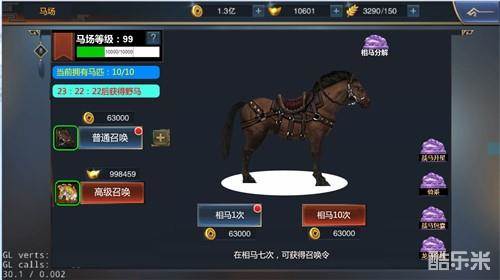 马场系统与战马系统同步上线,玩家在马场系统中可以通过相马来获得战马。马场的等级受主公等级所控制,在等级提高之后,玩家可以在其中获得额外收益。玩家每天都可以在马场中使用普通召唤与高级召唤来获得不同等级的战马,此外还可以通过相马来收集。