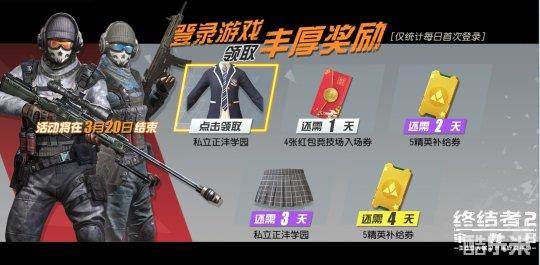 在新版本上线的一周时间内,玩家只需每日登录即可领取丰厚大礼,奖品包括:私立正沣高校套装,红包竞技场入场券、精英补给券等珍稀道具。登录活动不仅惊喜多多,同时还实行“双休制”,玩家只需保证在一周内总计有五天登录游戏,即可获得“全勤”认定,拿走所有奖品。