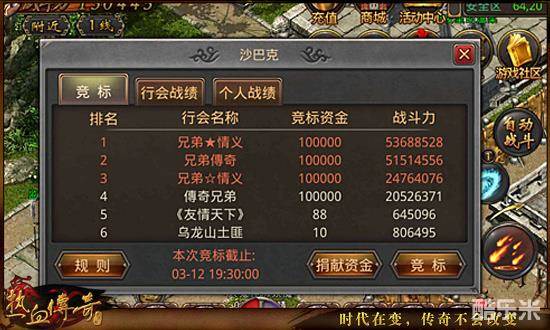 2、竞标上限为100000资金,如果出价相同,战斗力高的行会中标。
