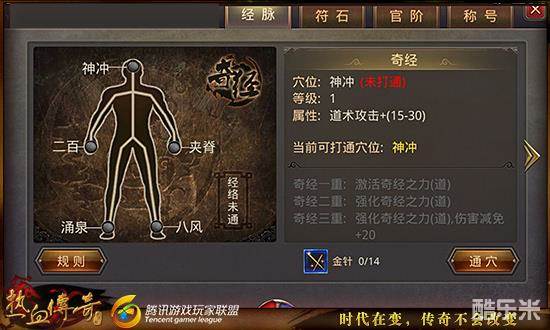 奇经上面有五个穴位,每通穴一次都可增加攻击属性,四个职业增加的攻击属性是一样的。当五个穴位都被打通的时候,便成功打通了一重奇经,并激活奇经之力。