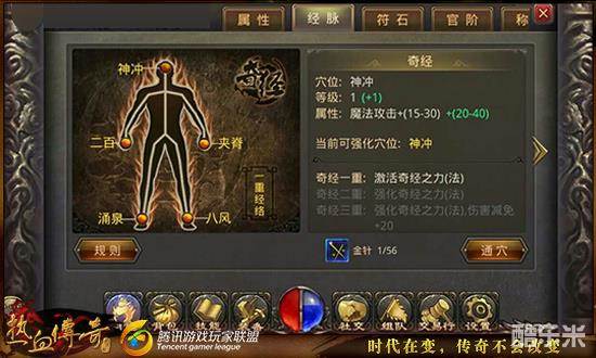 《热血传奇手机版》新版本更新后,进入角色属性界面的经脉玩法,除了原来的三个经络,还多了一个“奇经”。奇经是与经络玩法类似的新玩法,打通奇经中的穴位可以提升人物属性,全部打通还可以获得一个额外的技能。