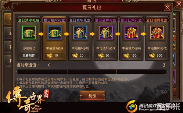 每个礼包需要制作成功后才可以制作下一级礼包!每次制作礼包失败后,可以获得一定的幸运值和一定数量的材料。当幸运值满格后,本次制作必将成功获得该礼包。同时成功制作后,当前幸运值将清空为0!