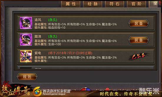 紫电坐骑的基本属性为所有攻击+3%,所有防御+3%,生命值+3%,魔法值+3%,无额外属性。