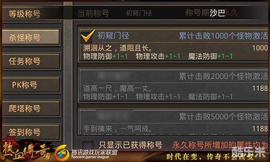 这个称号是所有称号里面最容易获得的,只要保证一定的杀怪数量就行了,最低击杀1000只怪物时就可以得到第一个杀怪称号“初窥门径”了,增加物理防御、物理攻击和魔法防御,这三个属性都是战士特别需要的。