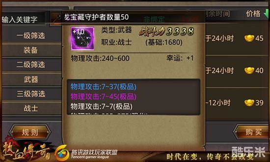交易行出售的东西虽然比较贵,但是细心一点也能淘到不少性价比高的好东西,比如50级的武器,在交易行里随处可见价廉物美的战士武器,作为小RMB来说,可以先买一套属性一般般的装备穿着先,足够下副本就够了,高级装备再慢慢攒材料自己打造吧。