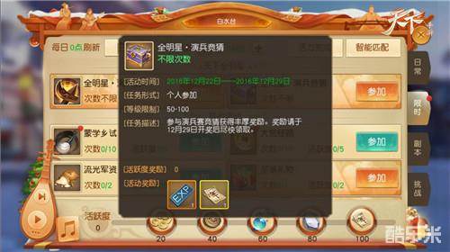 真3D极致画面,无缝大世界,网易顶级品质旗舰《天下》手游现已全平台开启。这天下,少年都在玩!《天下》手游12月全新版本惊艳登场,首届天下全明星联赛火热进行中!作为这场年末压轴好戏的重要一环,在经历层层PK后,演兵争霸赛终于在今日吹响决战的号角!这是一场实力与实力的巅峰对决,更是一次人气与人气的顶端相会。至高荣耀王者尊享,邀大荒少侠一同见证!