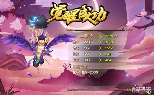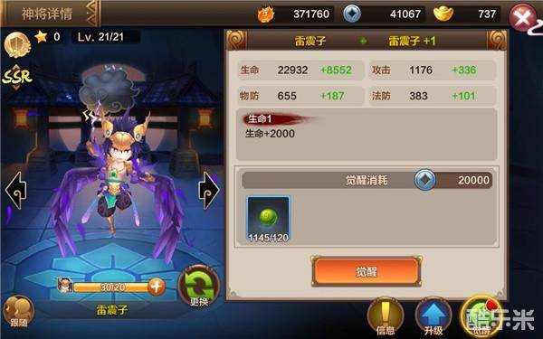 在神将详情的页面上可以看到神将觉醒的选项上,点开即可看到神将的身份信息以及攻防资料,通过觉醒面板上的功能按键可以看出觉醒前后的实力变化,从神将的生命、攻击、物防、法防等等将发生质的蜕变。